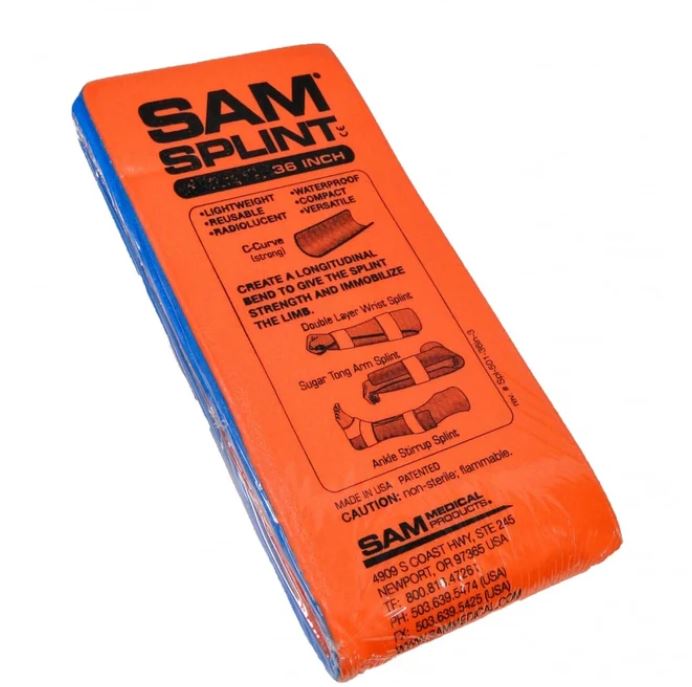 The SAM splint is a compact, lightweight, highly versatile device designed for immobilizing bone and soft tissue injuries in emergency settings. It consists of a layer of .016 inches strips of soft aluminum, with a polyethylene closed-cell foam coating.